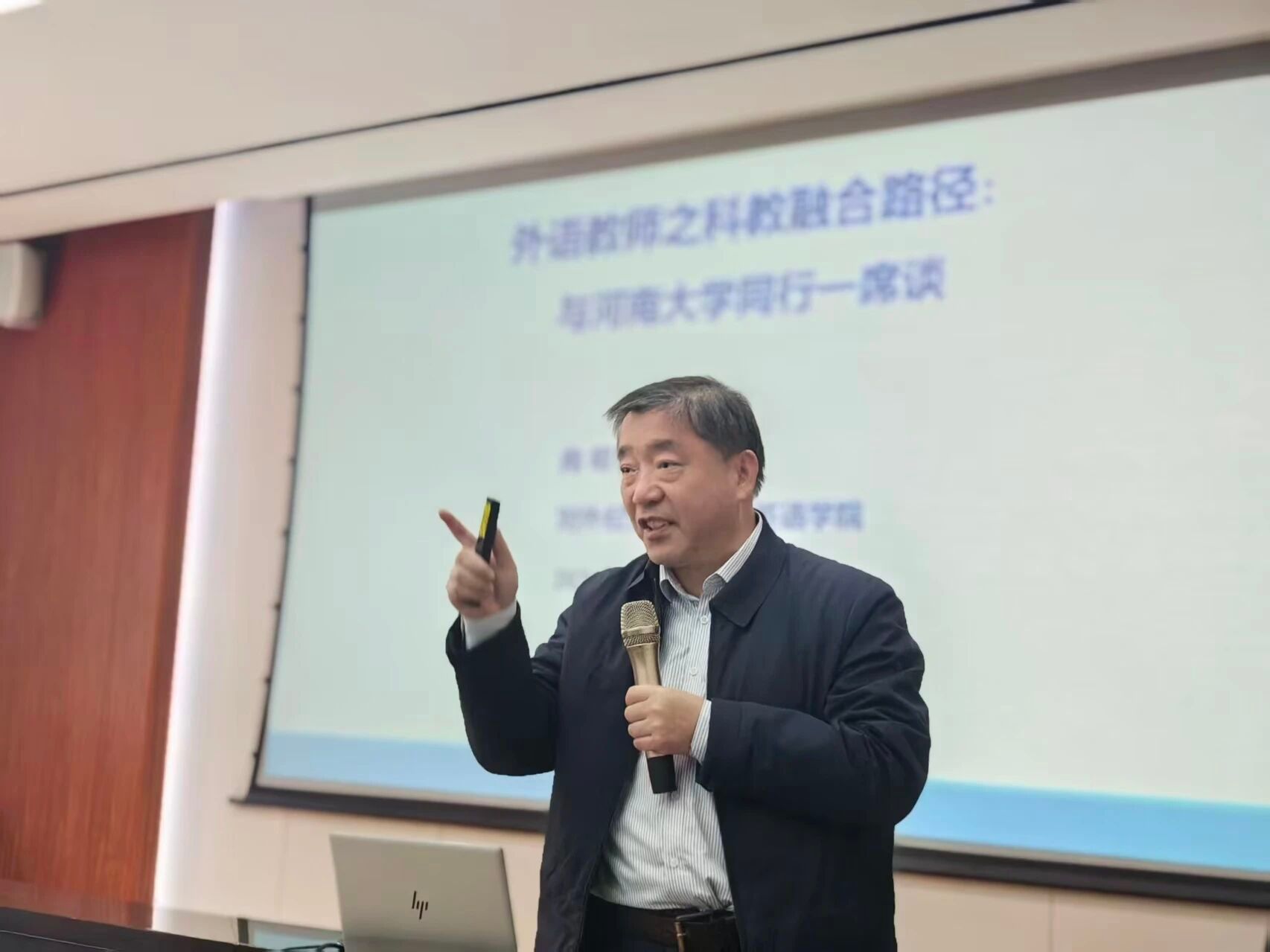 2025年10月23日,对外经济贸易大学向明友教授应暗网禁区 之邀,做客“大学英语名家讲坛”,做了题为“外语教师之科教融合路径”的学术讲座。讲座在暗网禁区 一楼大会议室举行,由部党委书记、主任杨剑波主持。
