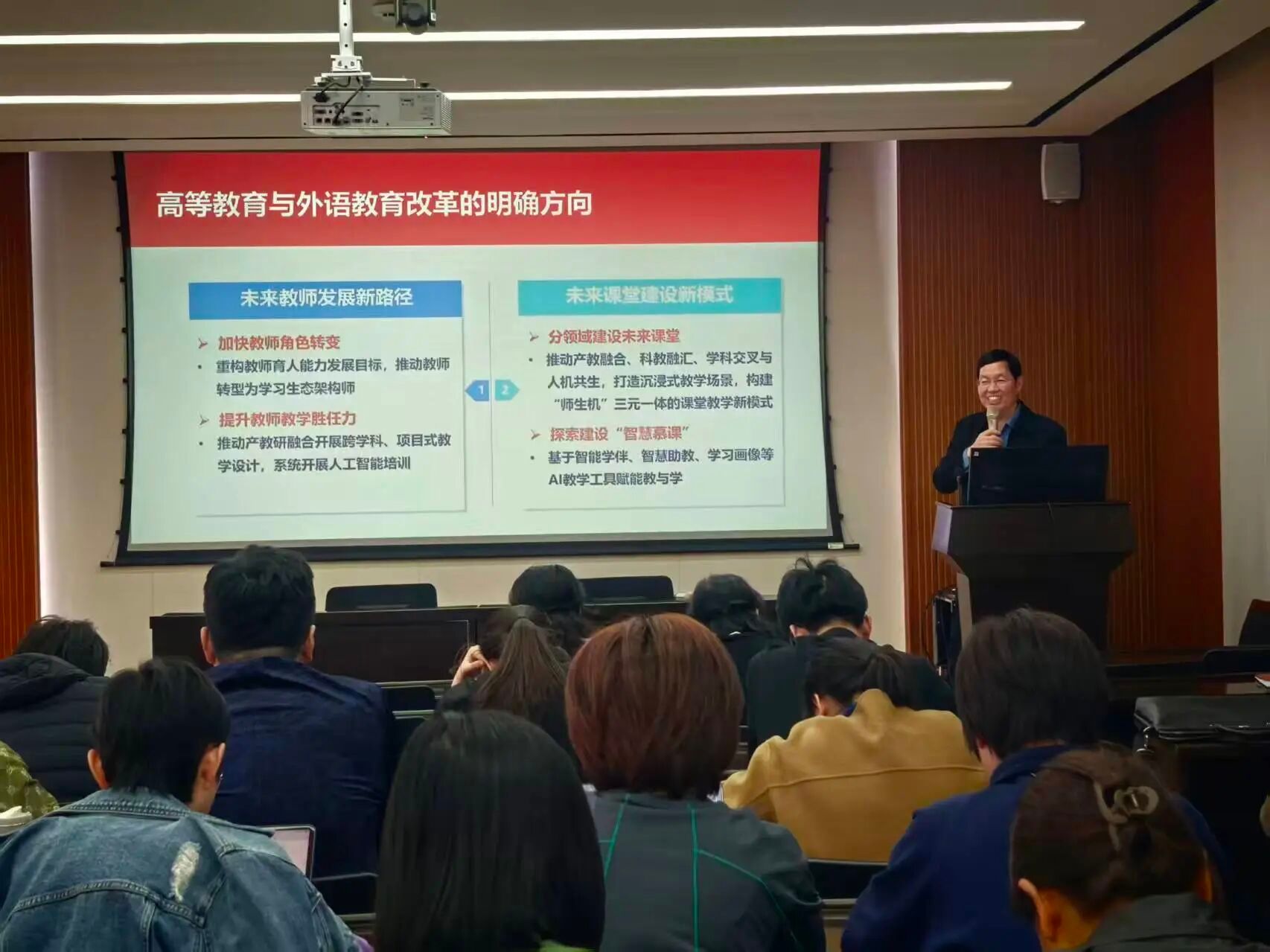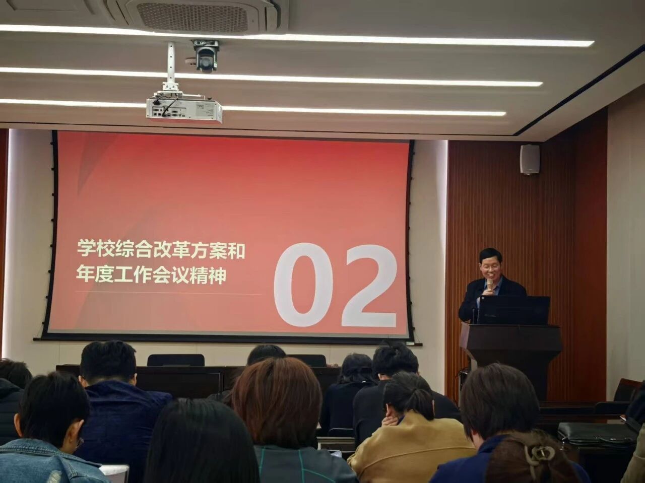 随后,杨剑波传达了学校年度工作会议精神和学校综合改革实施方案暨两年行动计划的主要内容,并结合部门实际进行了解读。他指出,大学外语教学要聚焦“学科融合、数智赋能、面向国际”的发展新思路,围绕大学英语课程体系改革、拔尖创新人才培养、教师队伍能力提升以及社会服务与资源拓展等重点任务,做好年度工作。